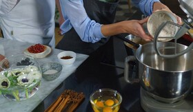 Beat the eggs into the bowl of the Electrolux Assistant kitchen machine and mix. Add all the dry ingredients and mix once again. Add the melted chocolate and Jerusalem artichoke syrup and stir until smooth.
