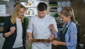 Set the Electrolux CombiSteamPro oven to the Hot steam mode and warm up to 170 degrees Celsius. Put the baking paper in the baking form and pour in the dough. Place it in the preheated oven for 25 minutes. When done, slightly cool down the brownie and cut it into small pieces.