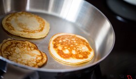 In an oiled pan, lightly brown two pancakes. Add 1 tbsp of blueberry juice to the mix and stir well. Cook two more pancakes with the new mix. Contunue adding 1 tbsp of blueberry juice each time until you run out of pancake mix.