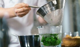 Put the greens and a little water into the Electrolux MasterPiece blender bowl and puree at a maximum speed until smooth. Pour olive oil in a deep frying pan or a saucepan. Place it on the Electrolux induction hob and set it to the heating level 12-13. Add a few twigs of thyme and garlic. Once the garlic is slightly golden, remove it and the thyme and add the shallots instead.