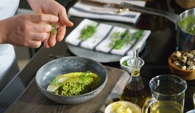 Saute over low heat (level 9-10) for 1-2 minutes, add the barley and mix. Pour in white dry wine. While stirring, let the wine evaporate almost completely. Then pour in the vegetable soup stock so it barely covers the barley. Add some more soup stock as it evaporates. When the barley is ready, add mashed herbs and mix well. Add the goat cheese and mix again. Slightly torch a leaf of romaine lettuce with a blow torch and decorate.