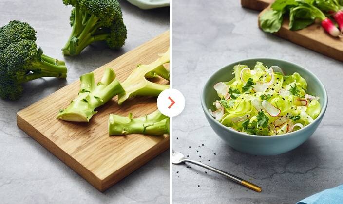3Broccoli stem saladSave your stems! Far from the lesser half of broccoli, the stems are just as nutritious as the florets. Slice the stalks thin with a sharp vegetable peeler and toss with your favourite salad ingredients.