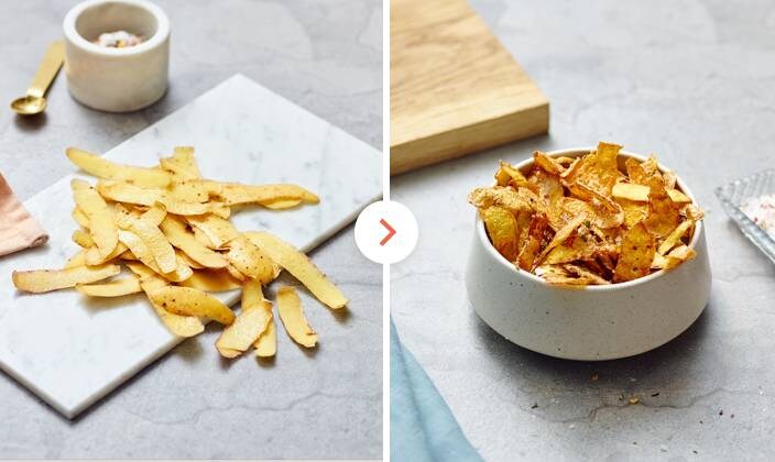 1Potato skin crispsPotato skins are often discarded when preparing potatoes. Instead, roast them in the oven with a drizzle of olive oil and pinch of salt. Treat your guests to a delicious, crispy pre-dinner snack.
